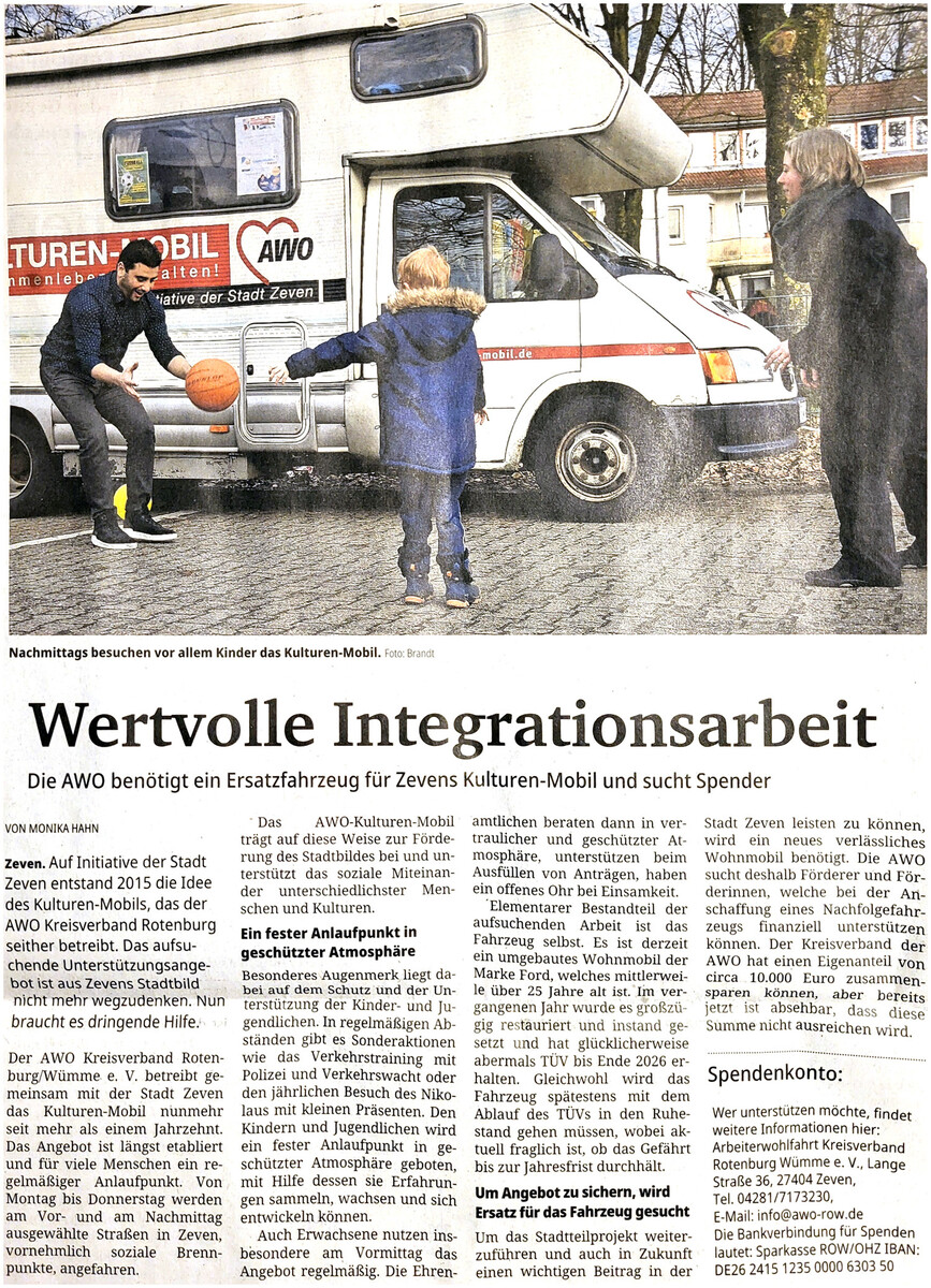 Die AWO benötigt ein Ersatzfahrzeug für Zevens Kulturen-Mobil.